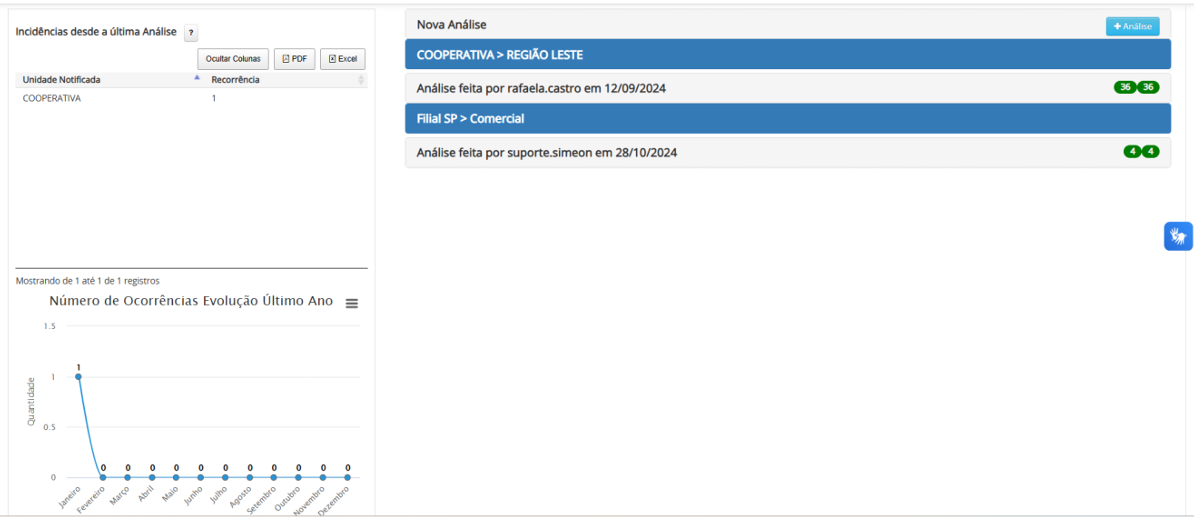 Nessa mesma tela, há uma tabela que apresenta as ocorrências registradas desde a última análise e nos últimos 12 meses, de acordo com a unidade gerencial (UG) notificada — mesmo que a unidade ainda não possua uma análise de risco cadastrada. Logo abaixo, um gráfico ilustra essas informações de forma visual, facilitando a interpretação dos dados.