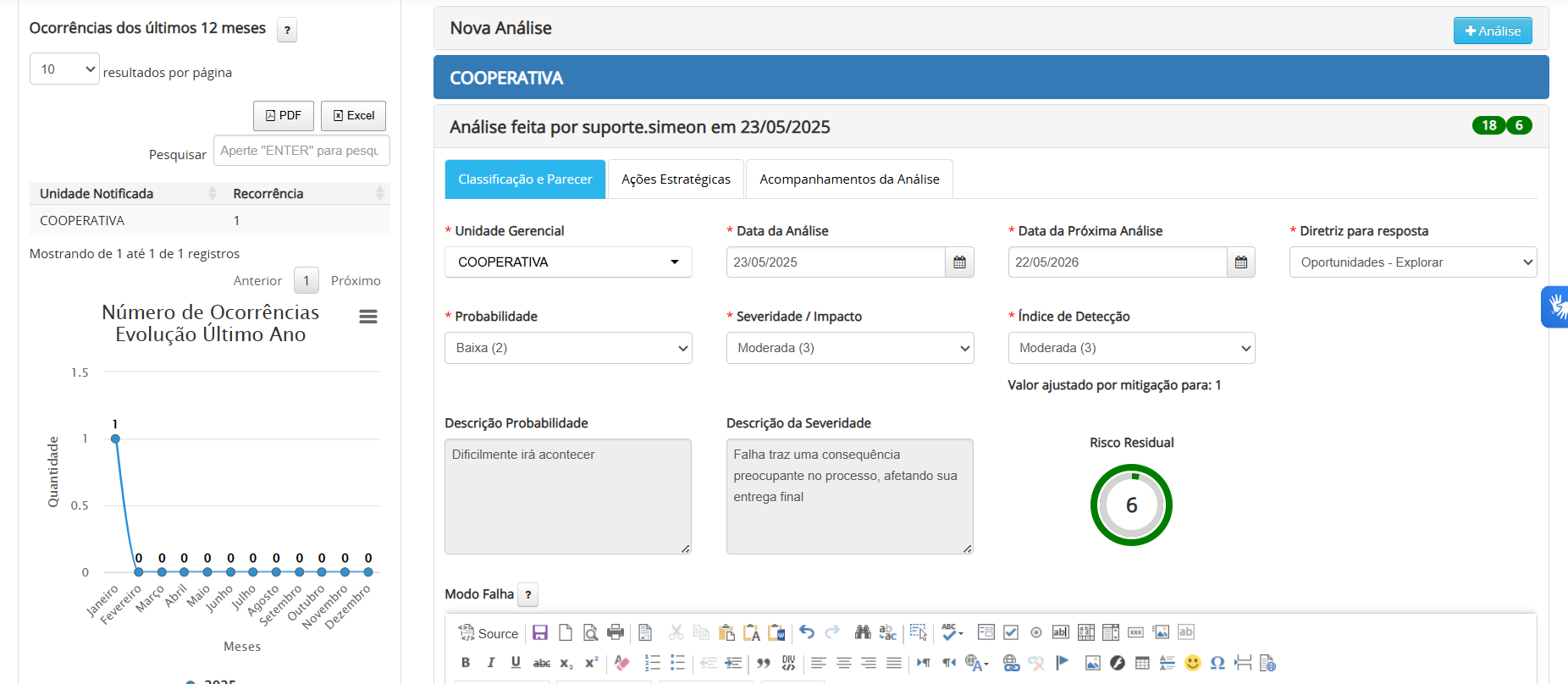 Após seguir as etapas deste artigo, você estará apto a registrar análises de risco de forma estruturada, atualizar avaliações conforme a data da próxima análise, incluir e vincular planos de ação e acompanhamentos, acompanhar a evolução dos riscos por unidade gerencial e gerenciar as permissões de acesso. Essas práticas permitem um controle eficiente, transparente e sistemático da gestão de riscos, apoiando a tomada de decisão e a mitigação de impactos para a organização.