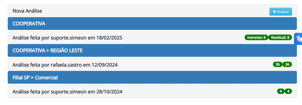 Após salvar, a análise será listada com as demais agrupando por unidade gerencial. Nas análises já realizadas mostra o usuário de inclusão, a data da análise e o Risco Inerente e Residual.
