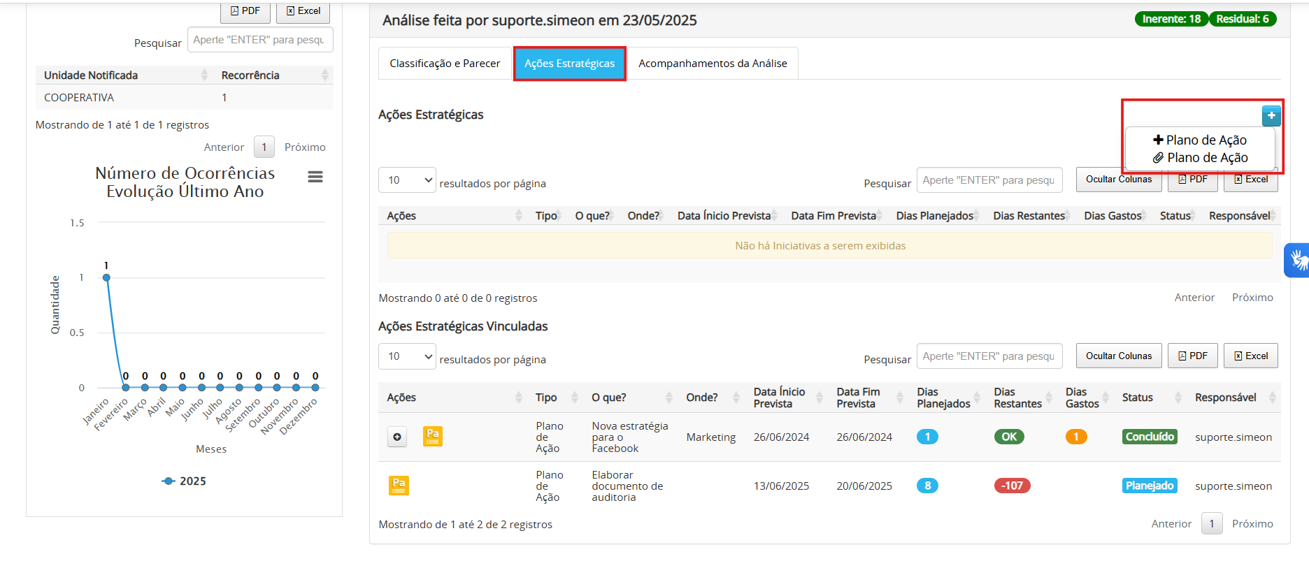 Dentro da análise criada após salvar será habilitada a aba “Ações estratégicas”, onde é possível incluir / vincular planos de ações que envolvem a análise desse risco. Esse plano de ação aparecerá na seção “Plano de Ação” do risco e na tela inicial do responsável na box de “Planos de Ação (5w2h)“, listando os planos de ações, ações e tarefas a serem executadas.
