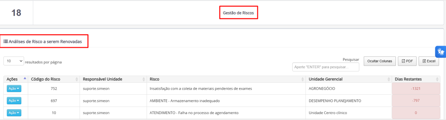 Após a realização da primeira análise do risco, é necessário renovar as análises de acordo com a data da próxima avaliação, calculada com base na análise anterior. Durante essa renovação, o EPA notifica o responsável pelo risco, o usuário que realizou a análise e o analista de riscos na tela principal, na tela principal dentro da box de “Gestão de Riscos“.