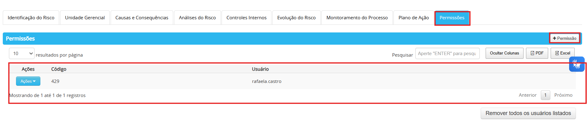 Já na aba “Permissões” é possível selecionar usuários para visualizarem os dados básicos do risco, bem como suas análises e planos de ação.