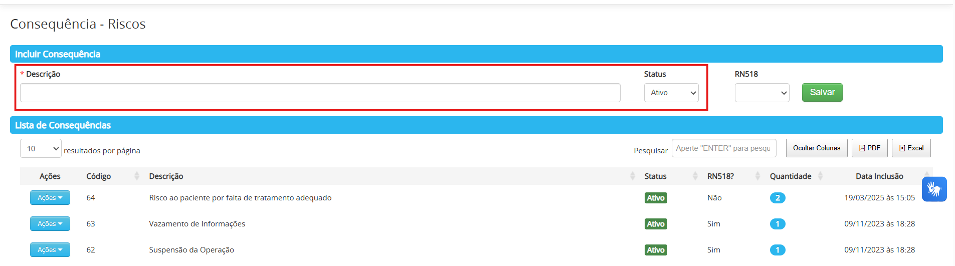 Nessa tela é possível digitar a identificação da consequência, informar se está ativa ou não e indicar se faz parte ou não da RN518, e em seguida, clicar em Salvar.