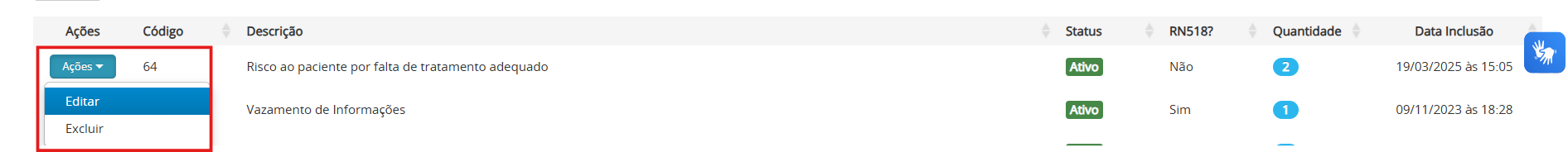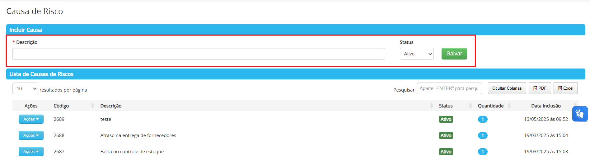 Concluído o registro da causa, ela ficará disponível na listagem para edição ou exclusão pelo botão Ações, observando que só é possível excluir uma causa se ela não estiver vinculada a nenhum risco  a coluna Quantidade indica esses vínculos.