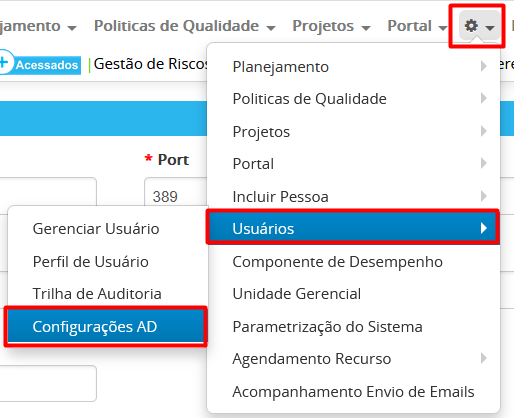 1 – Para testar conexão do EPA com AD, primeiro faça o login no EPA e acesse o menu Engrenagem > Usuários > Configurações AD