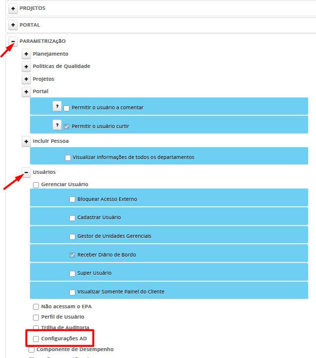 2 – Caso o usuário não tenha permissão para acessar essa tela, acesse o menu Parametrização > Usuários. No cadastro do usuário, marque a permissão Configurações AD.