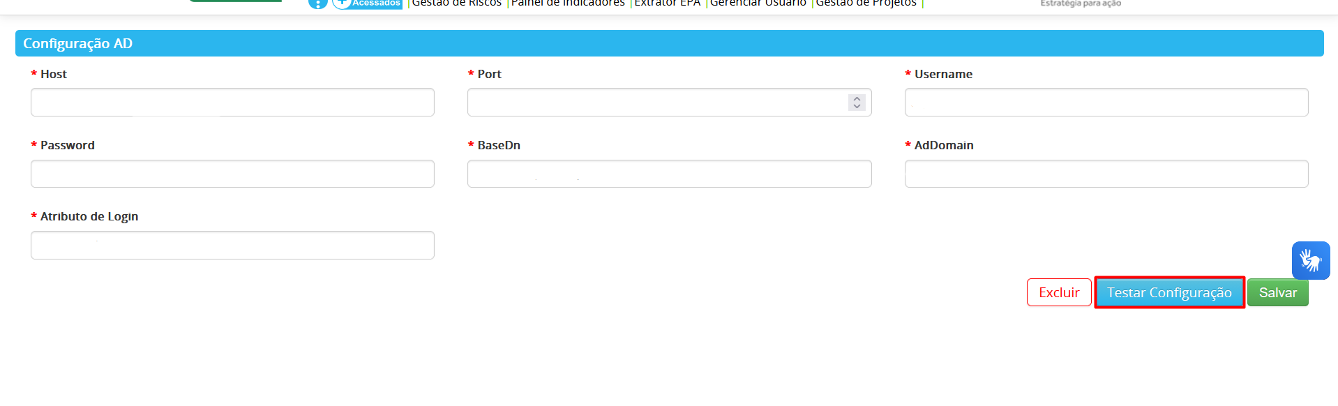 3 – Na tela de Configurações AD clique no botão Testar Configuração.